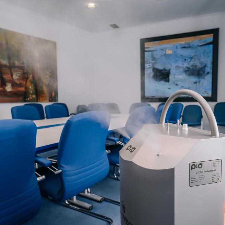 DECON Professional genererer en mikrobiologisk meget effektiv aerosol på en fysisk perfekt måde ved at pumpe dekontaminanten via det innovative PIO Flash® distributionssystem. Systemet sikrer genereringen af meget små dråber, som fordeles homogent i hele rummet på grund af deres lille størrelse og meget intensive distribution. Systemet arbejder ud fra en kombination af fordamningsfasen og meget fine dråber af tør hydrogenperoxid-tåge. Effektiviteten af enheden forbedres yderligere ved den optimale placering af et dobbelt distributionssystem på selve enheden, hvilket gør det muligt for enheden at dekontaminere større rum eller muliggør distribution af en større mængde dekontaminant på samme tidsenhed. Placeringen af distributionssystemet på enheden (sammen med dens form, hældningsvinkel og varighed af aerosoldistributionen i rummet) bidrager til den optimale og ensartede distribution af dekontaminanten i hele rummet. Da den gasformige blanding af midlet trænger ind i de mindste revner og porer, muliggør enheden ødelæggelsen af mikrobiologiske organismer, selv i de mest skjulte og utilgængelige detaljer i rummet. Disse steder kan ikke effektivt desinficeres med konventionelle desinfektionsprocedurer.