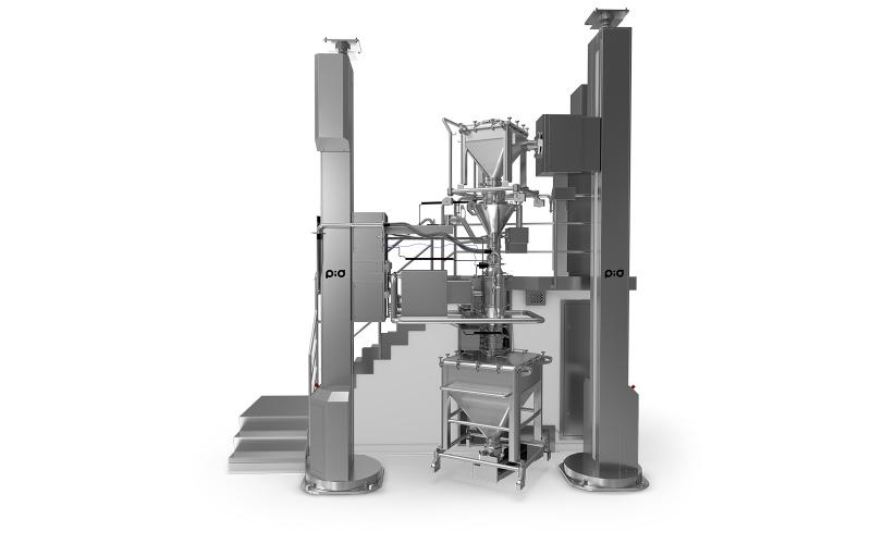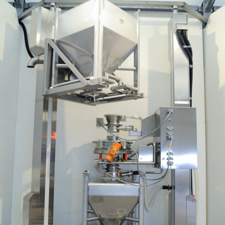- The lifting device for the input packaging ensures the positioning of the input packing and automatic dosing of the raw material into the process assembly