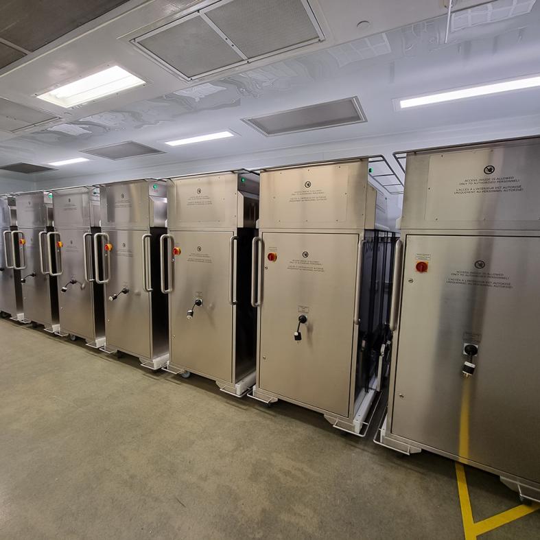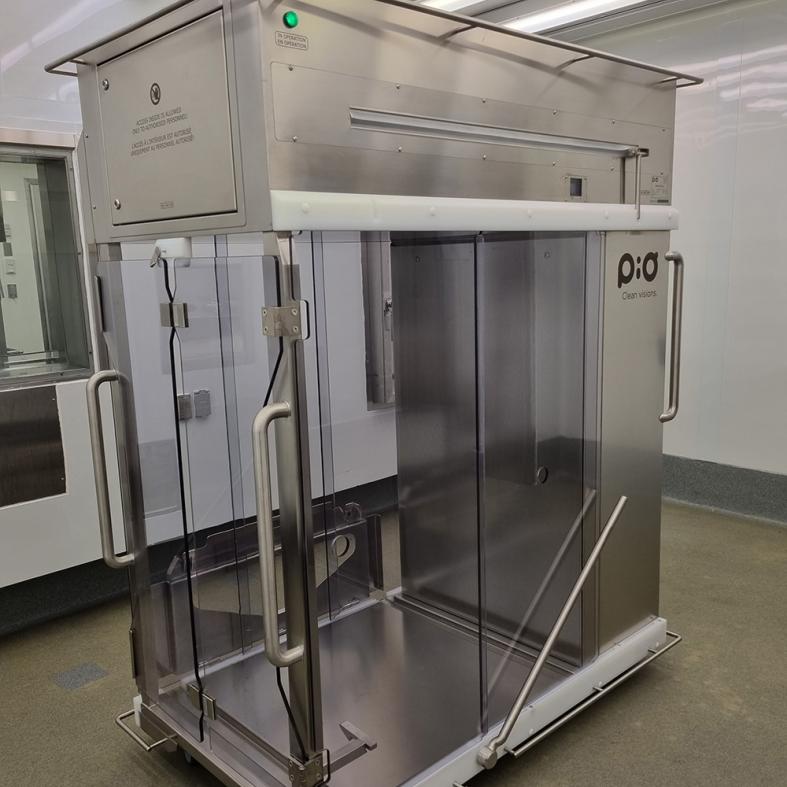 The system features horizontal laminar airflow; filtration is performed through a G4 pre-filter and an absolute HEPA H14 filter. The air is pushed and filtered through the absolute H14 filter and distributed through a distribution mesh into the working area. The LAF system is equipped with four wheels with built-in brakes.