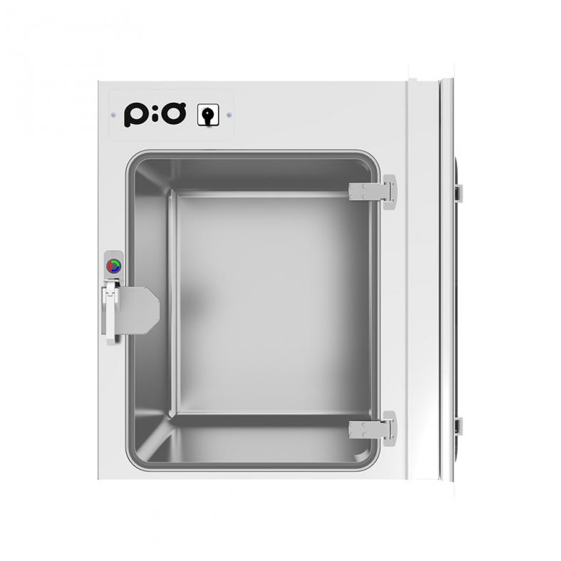 Passive pass-box chambers with interlock door function prevent direct opening of one space to another when material passes between spaces.