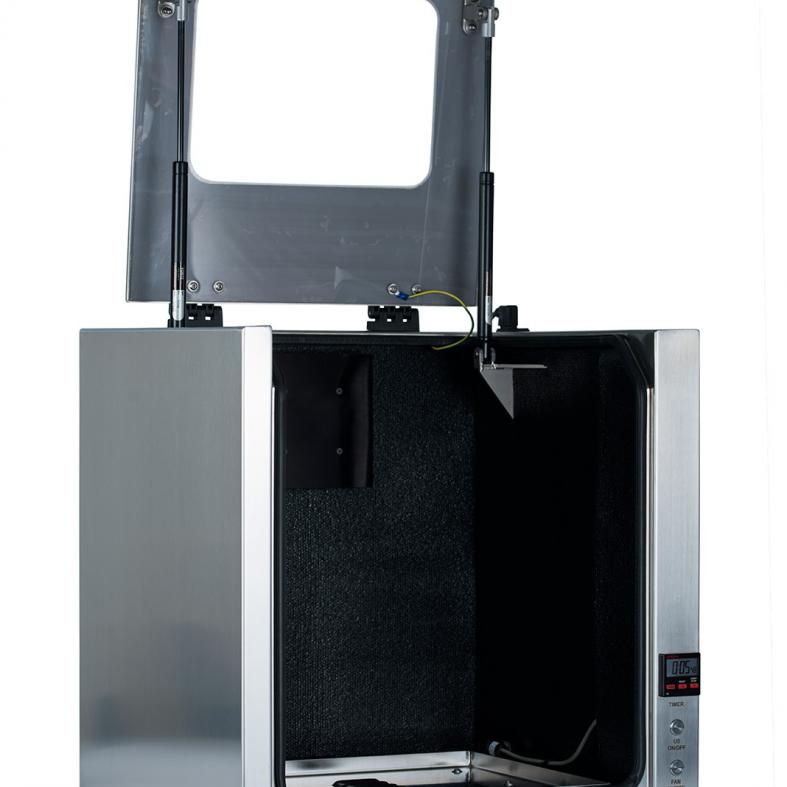 Gennem store gennemsigtige overflader er det muligt at overvåge forholdene inde i skabet uden at åbne låget. Indsættelse af enheden i skabet er helt nemt via det store låg. Gasfjedre, der er indbygget i låget, gør åbningen lettere for brugeren, samtidig med at låget holdes åbent i den øverste position uden brugerens hjælp. En speciel låseanordning sikrer, at låget er korrekt lukket, så ingen støj slipper ud. Tilslutning af enheden til strømforsyningen udgør ikke en hindring, da skabet bagpå har en dobbeltlås, gennem hvilken strømledningen kan installeres. Låseanordningens design forhindrer dog, på trods af tilstedeværelsen af strømledningen, at støj slipper ud til omgivelserne. Der er også en bakke i bunden, der holder eventuelle væskespild.
