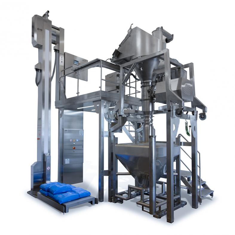 - The lifting device for the input packaging ensures the positioning of the input packing and automatic dosing of the raw material into the process assembly